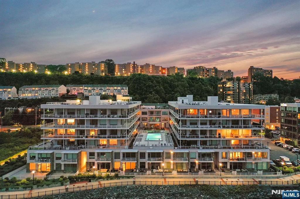 Luxury waterfront living at The Glass House in Edgewater. This 1BR + Den, 1BA condo offers 998 sf of open-concept living plus a 225 sf private balcony with Hudson River and Manhattan skyline views. Floor-to-ceiling windows and 10-ft ceilings fill the home with natural light. Features include custom closets, designer Phillip Jeffries wallpaper, a chef’s kitchen with Caesarstone countertops, Sub-Zero & Wolf appliances, and a sleek backsplash. Spa-like bath with oversized vanity, modern fixtures, and soaking tub. Versatile den works as office, guest space, or nursery. Smart home features include Nest thermostat and keyless entry. Amenities: rooftop terrace with panoramic NYC views, entertainment lounge, resort-style pool, fitness center, playroom, concierge, package receiving, and on-site management. Includes private parking and storage unit. Pet-friendly with nearby green space and waterfront paths. Easy commute via express bus or ferry with shuttle service. HOA covers water, sewer, trash, and all amenities.