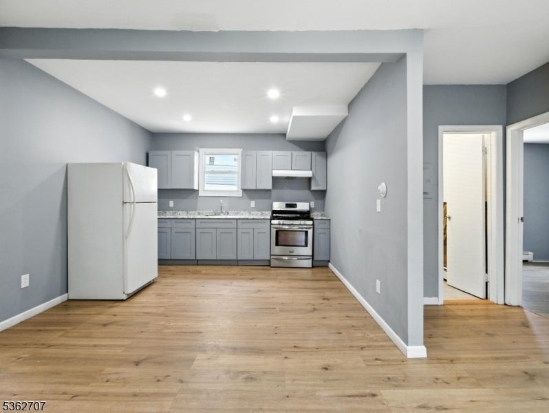 Spacious and freshly updated, this 3-bedroom, 1-bath apartment offers modern living with an open floor plan and stylish finishes. The bright kitchen features sleek grey cabinetry, granite-style counters, stainless steel gas stove, and ample storage, seamlessly flowing into a generous living/dining area with recessed lighting and vinyl wood flooring throughout. Each bedroom provides plenty of natural light and space, while the bathroom impresses with bold, modern tile and a contemporary vanity. Enjoy neutral tones, baseboard heating, and a layout perfect for both relaxing and entertaining. Ready for immediate move-in, this inviting home blends comfort and style in every room.