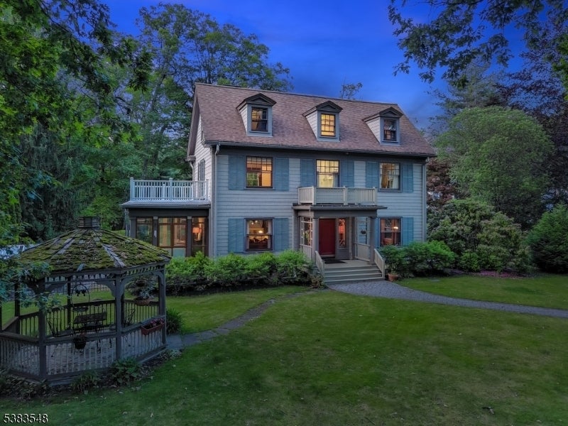 HISTORIC GEM ON GORGEOUS 1 ACRE LOT ON IDYLLIC MORRISTOWN STREET! Own a piece of history in this stunning 1901 center hall colonial perched on an elevated lush green lot w/ Victorian wood gazebo, vegetable garden w/ greenhouse & charming brick patio w/ grapevine-covered pergola. Timeless architectural details like leaded & stained glass, exquisite millwork, beautiful hardwood floors & unique built-ins provide a backdrop to a friendly floor plan full of space & natural light. Front-to-back Foyer welcomes you with an open wide hardwood staircase that ascends to the 3rd level. Step into the spacious Living Room w/ wood-burning fireplace, bookcases, leaded glass windows & French doors to bright & breezy Sunroom w/ walls of windows on 3 sides & access to vegetable garden & level backyard. Formal Dining Room enchants with crystal chandelier & oversized windows drenched in light. Eat-in Kitchen is straight out of an English manor house w/ stunning blue Aga cooker, cherry inset cabinetry, refrigerator drawer, beverage fridge, stained glass windows, ample cabinet space & access to back staircase. 2nd Level features 3 Bedrooms & 2 Full Baths, including cozy Primary ensuite with fireplace & private balcony! 3rd Level has 3 more Bedrooms w/ ensuite baths (both with original clawfoot tubs!) & the option to convert one to a sitting room, office or gym! Lower Level boasts rec space, Laundry & lots of storage. Quiet tree-lined neighborhood just blocks from charming Morristown Green!
